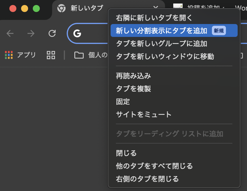 タブを右クリックして「新しい分割表示にタブを追加」を選択したら2画面になります。