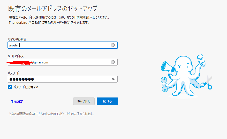 名前は何でも良いです。私も設定しながらわかってきたのですが、Thunderbirdは色々なメールを一つに集約できるツールなんですね。最初はGmailのアドレスを入れてパスワードを入れていきます。