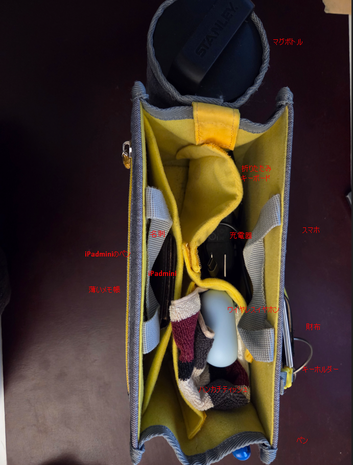 iPadmini5は写真には入ってないですが、収まりました。スマホは撮影したので入ってないですが以下略。