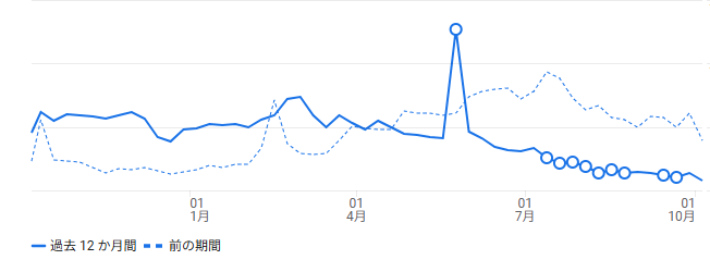 点線が昨年、今年が実線。今年5月くらいから下降線。